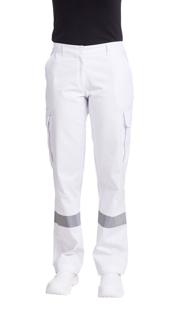 Pantalon ambulancier femme. Ceinture élastique côtés avec 7 passants. Braguette zippée. 2 poches italiennes. 2 poches cuisses à rabat fermé par Velcro®. Poche stylo sur cuisse droite. 2 poches arrières à rabat fermé par Velcro®. | Bandes rétroréfléchissantes 30 mm. E.J. : 78 cm (+ 6 cm).