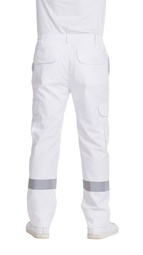 Pantalon ambulancier homme. Ceinture élastique côtés avec 7 passants. Braguette zippée. 2 poches italiennes. 2 poches cuisses à rabat fermé par Velcro®. Poche stylo sur cuisse droite. 2 poches arrières à rabat fermé par Velcro®. | Bandes rétroréfléchissantes 30 mm. E.J. : 78 cm (+ 6 cm).