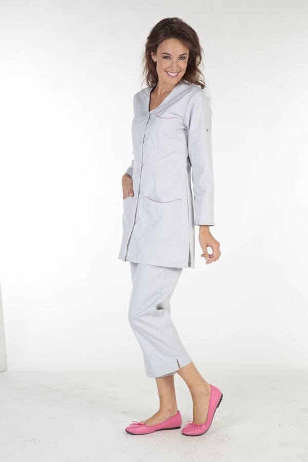 Tunique femme. Encolure fantaisie ton sur ton. Fermeture milieu devant par 5 pressions ton sur ton. 2 poches basses plaquées avec passepoil contrasté. Manches transformables. Coupe cintrée. Longueur : 80 cm.