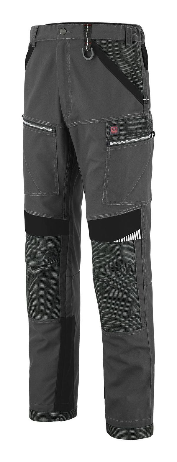 Pantalon à poches genouillères. Ceinture élastiquée côtés, 6 passants doubles. 2 poches italiennes dont 1 avec poche monnaie, 1 poche cuisse à soufflet avec rabat à grippers, 1 poche mètre en biais avec surpoche, 1 poche cuisse à rabat avec poche mètre intégrée et surpoche téléphone. 2 poches genouillères en tissu renforcé réglables en 2 niveaux de hauteur avec ouverture par le haut. Sangle porte-outils. Renforts arrières bas de jambes. E.J. : 82 cm + ourlet de 5 cm