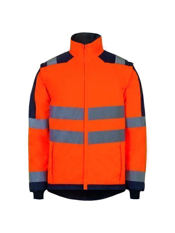Blouson haute visibilité. Fermeture centrale à glissière avec curseur réversible pour fixation à la parka KITA®. 2 poches basses avec rabat, fermées par fermeture à glissière. Manches préformées amovibles et poignets en bord-côte avec patte d'accrochage. Dos protège-reins. Trappe d'accès pour le marquage. | Bandes microbilles rétroréfléchissantes de largeur variable selon les tailles.