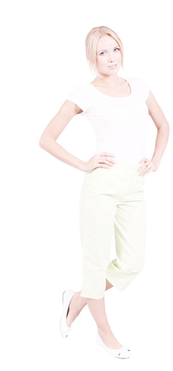 Pantacourt femme. Taille semi-élastiquée effet ventre plat. Sans poche. Fentes latérales bas de jambe. E.J. : 52 cm.