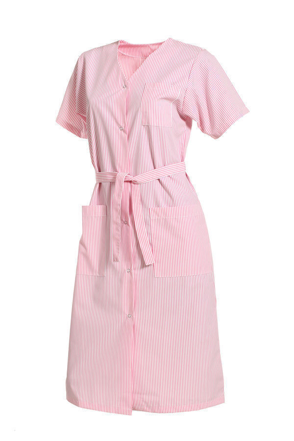 Blouse femme encolure V. Fermeture milieu devant par 6 grippers. Ceinture amovible. Poche poitrine et 2 poches basses plaquées. Manches courtes avec pattes pressionnées. Longueur : 105 cm.