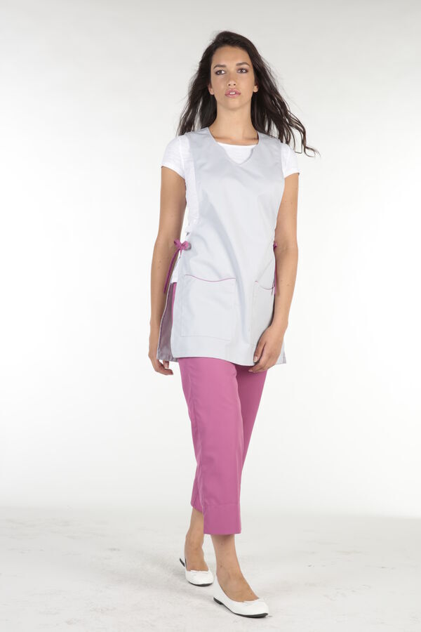 Chasuble femme. Encolure fantaisie ton sur ton. 2 poches basses plaquées avec passepoil contrasté. Fermetures côtés par lacets. Fentes côtés. Longueur : 75 cm.