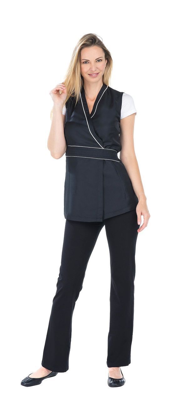 Tunique sans manches à fermeture croisée cache-cœur, ceinture et lien. Passepoil contrasté à l'encolure et ceinture. Sans poche. Fentes manches et côtés. Longueur : 75 cm.
