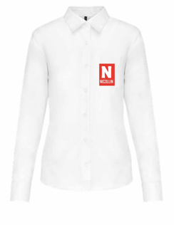 Chemisier femme blanc manches longues avec le logo Nicollin sur le coeur et logo SUD SERVICE sur la manche droite.