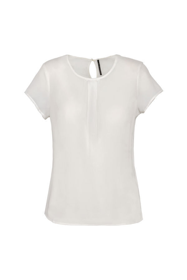 Blouse femme en crêpe. Encolure ronde avec biais. Petites fronces à l'encolure devant. Fermeture à l'arrière par 1 bouton recouvert.
